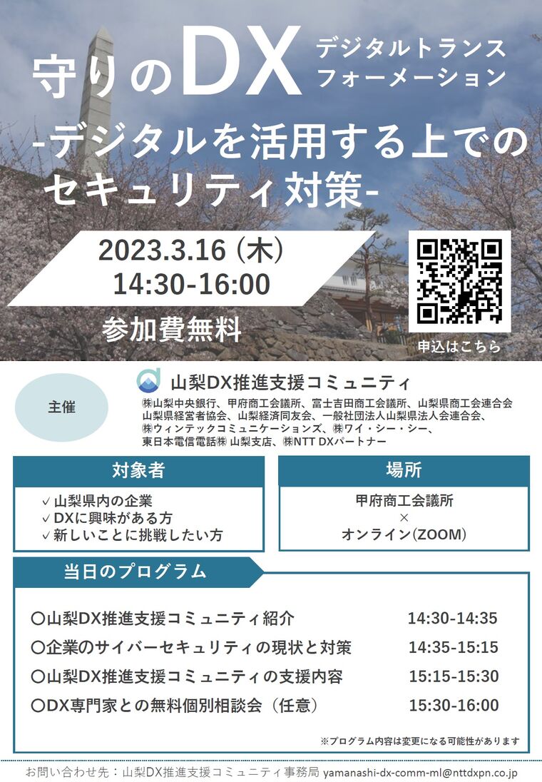 日時 2023-03-16 14:30~16:00 (終了) 場所 甲府商工会議所 講師 山梨DX推進支援コミュニティ 参加費 無料 分野 DX/ICT 申し込み方法 申し込みはこちらから(やまなしDXエンジン) お問い合わせ