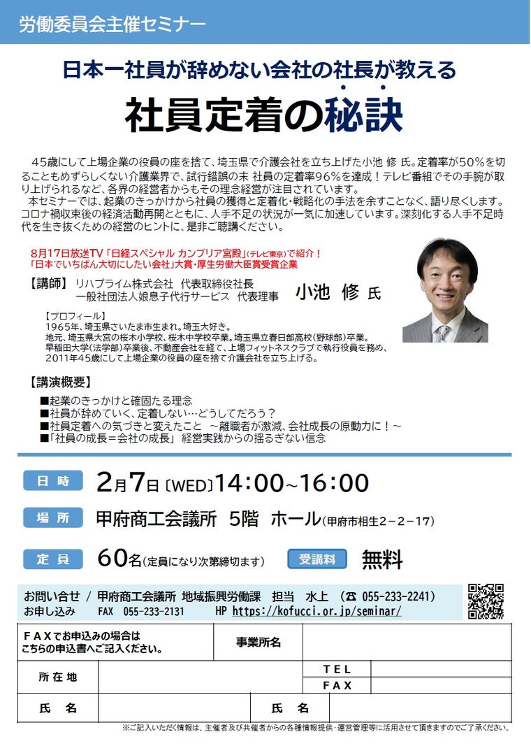 日時 2024-02-07 14:00~16:00 (終了) 場所 甲府商工会議所 5階 ホール 講師 リハプライム株式会社 代表取締役社長 小池 修 氏 参加費 無料 分野 労務 申し込み方法 【お申込みフォーム】※リンク先Googleフォーム お問い合わせ