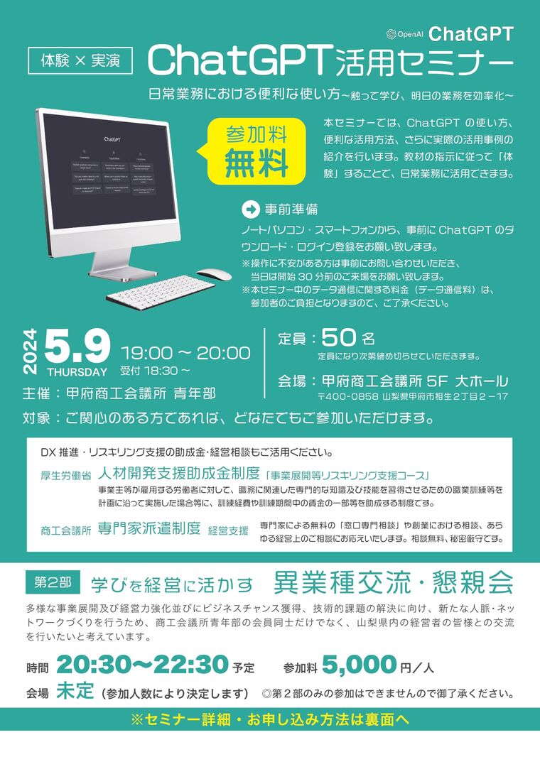 日時 2024-05-09 19:00~20:00 (終了) 場所 甲府商工会議所 5階 多目的ホール 講師 PEACE NET 代表 山本 満夫 氏 参加費 無料 分野 IT 申し込み方法 申し込みフォーム、または資料裏面の申込書を郵送・FAXにてお送りください。