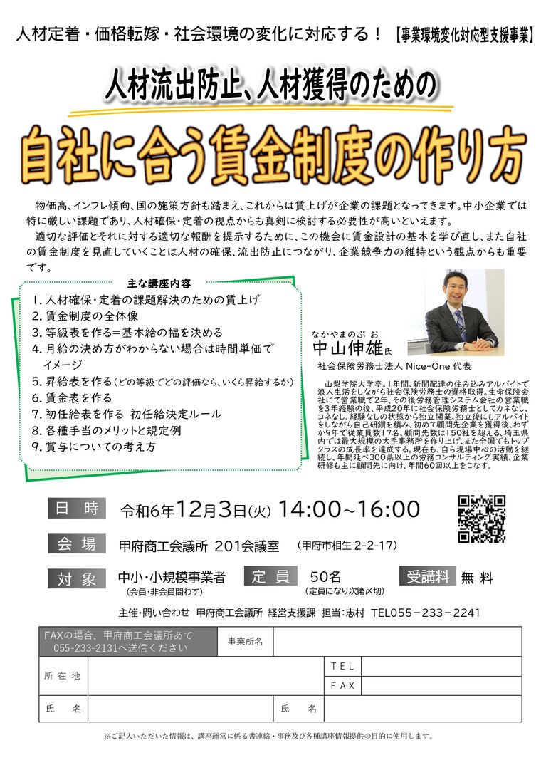 日時 2024-12-03 14:00~16:00 (終了) 場所 甲府商工会議所 201会議室 講師 社会保険労務士法人 Nice-One 代表 中山 伸雄 氏 参加費 無料 分野 労務 申し込み方法 【お申込みフォーム】※リンク先Googleフォーム お問い合わせ