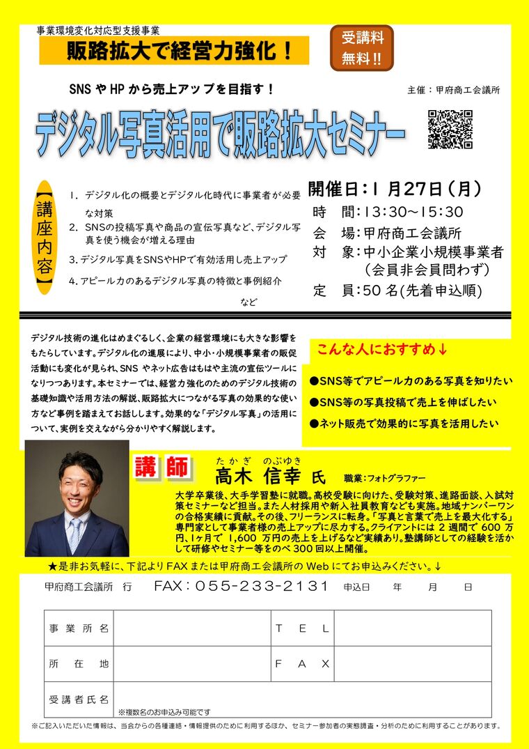 日時 2025-01-27 13:30~15:30 (終了) 場所 甲府商工会議所 5階 ホール 講師 フォトグラファー 高木信幸 氏 参加費 無料 分野 SNS 申し込み方法 【お申込みフォーム】 お問い合わせ