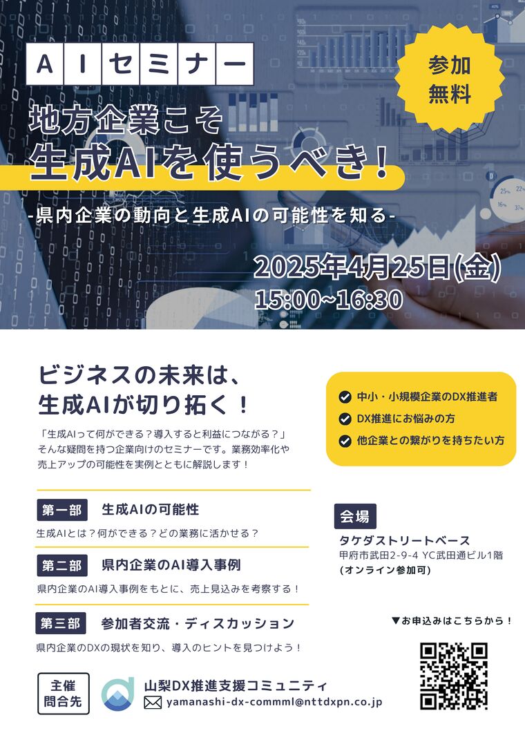 日時 2025-04-25 15:00~16:30 (終了) 場所 タケダストリートベース(甲府市武田2-9-4 YC武田通ビル1階)※オンライン参加可 講師 山梨DX推進支援コミュニティ