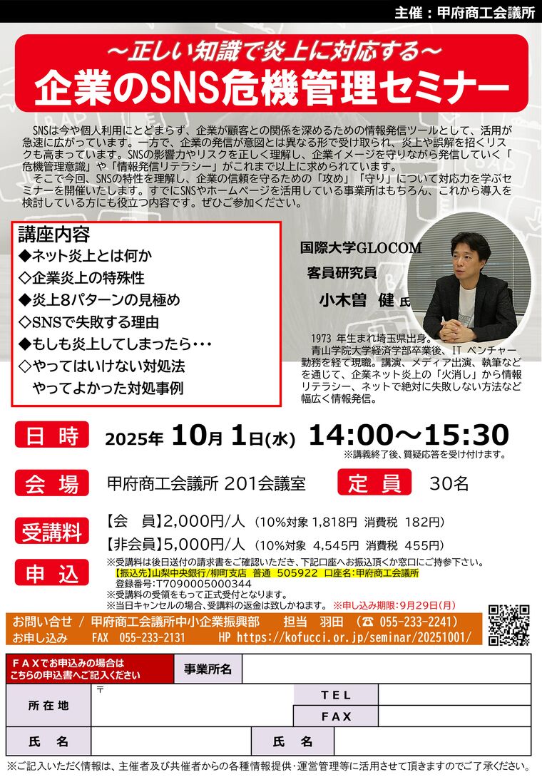 日時 2025-10-01 14:00~15:30 (終了) 場所 甲府商工会議所 講師 国際大学GLOCOM客員研究員 小木曽 健 氏 参加費 会員 2,000円 非会員5,000円