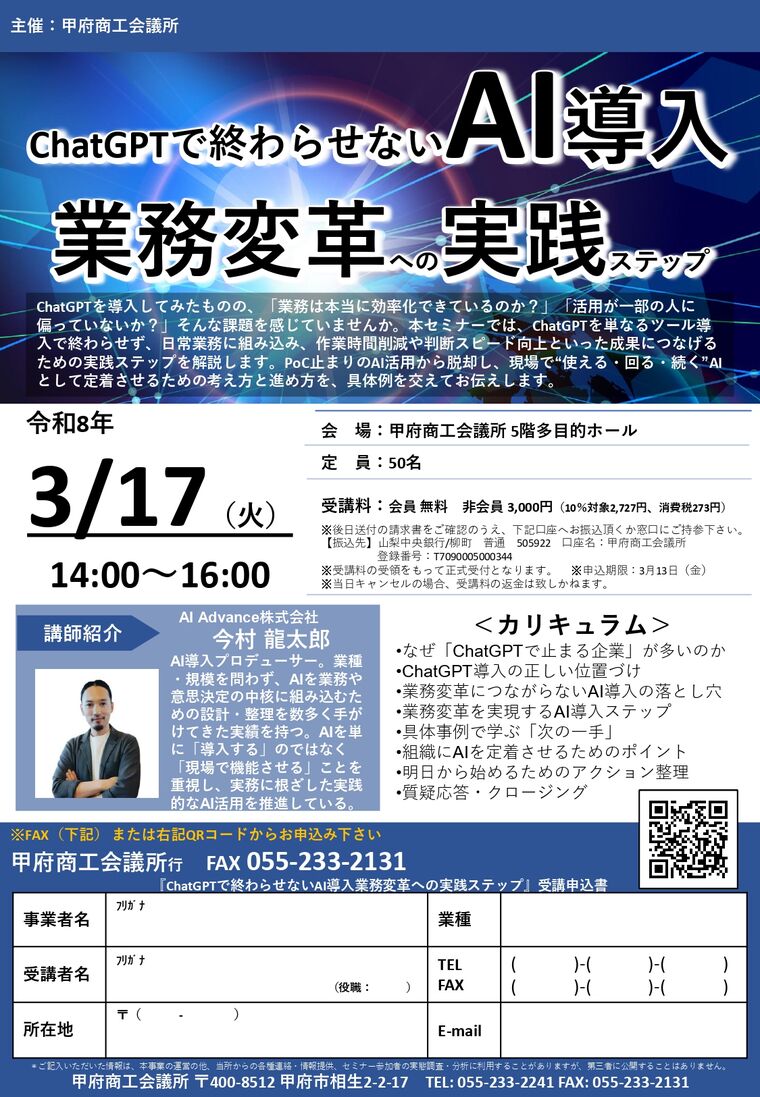 日時 2026-03-17 14:00~16:00 場所 甲府商工会議所5階多目的ホール 講師 AI Advance株式会社 今村龍太郎 氏 参加費 会員 無料 非会員 3,000円 分野 IT 申し込み方法 【お申込みフォーム】 お問い合わせ