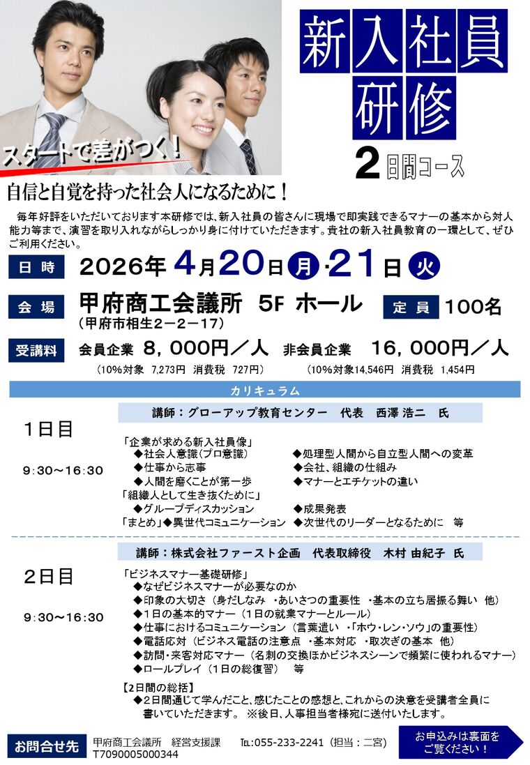 2回目: 2026-04-21 9:30~16:30場所 甲府商工会議所5階ホール 講師 1日目…グローアップ教育センター 代表 西澤浩二 氏